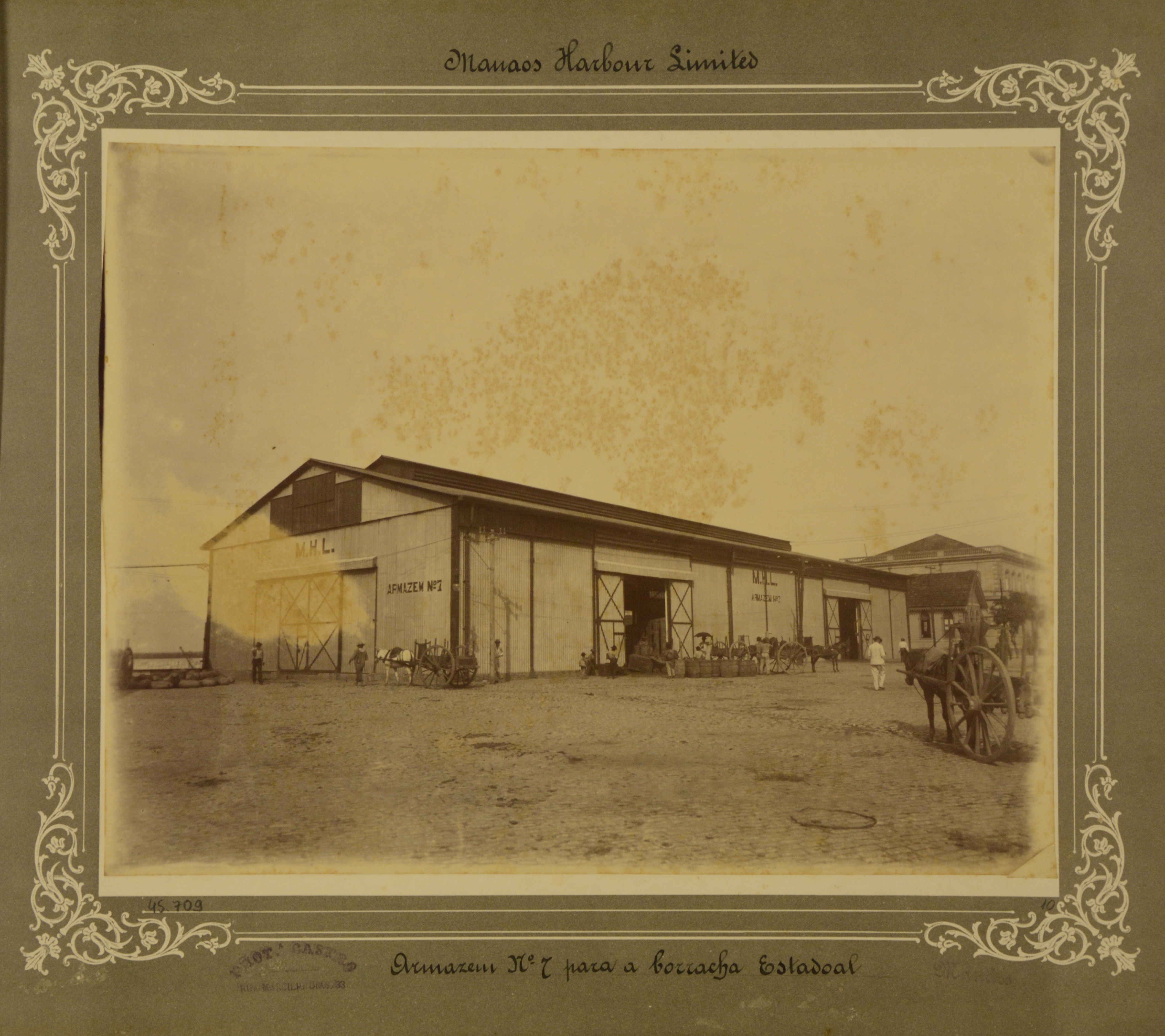 Armazém e charretes desembarcando mercadoria (borracha). Pessoas trabalhando.