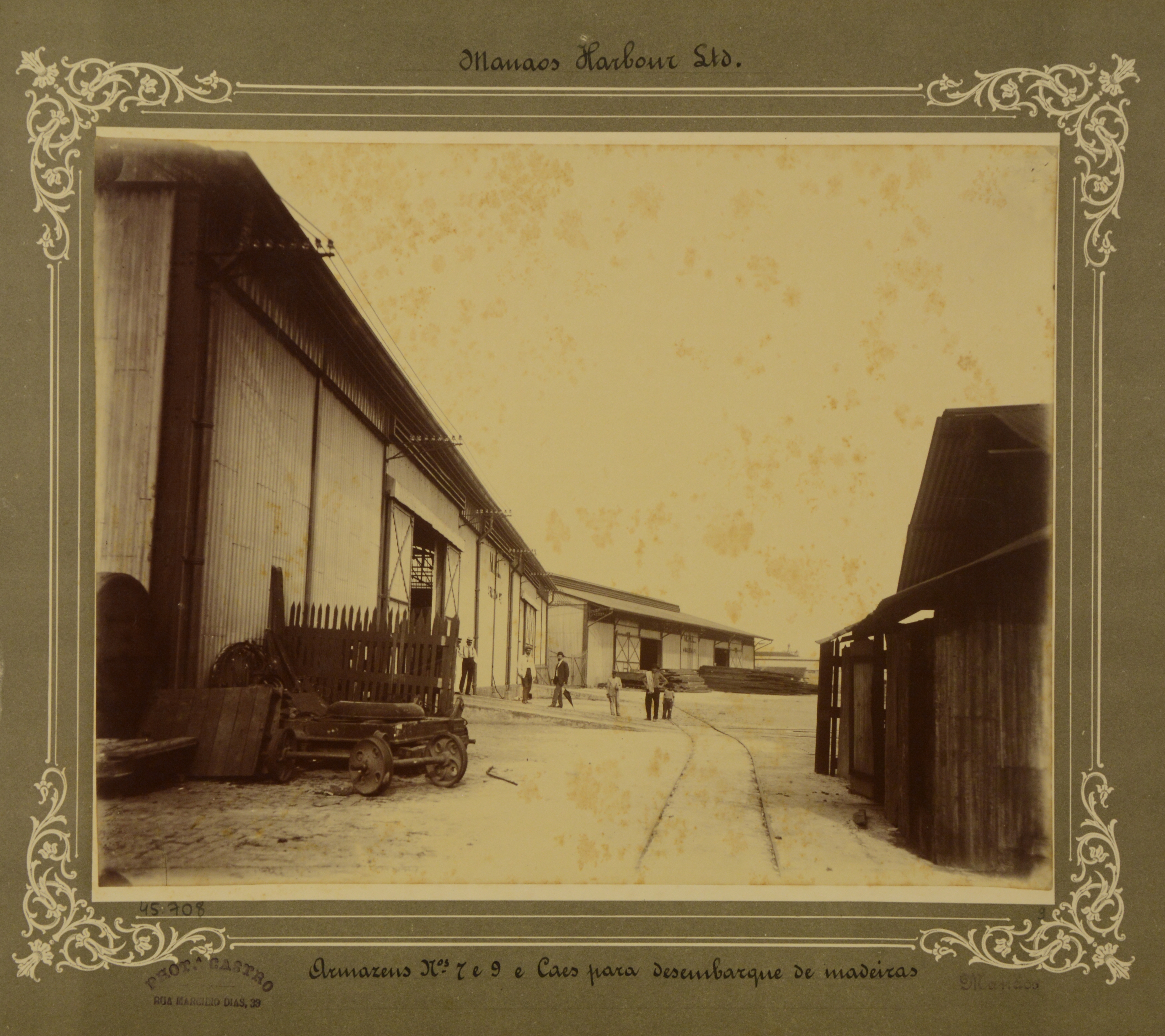Os armazéns e a linha de ferro para o transporte de mercadorias ao cais. Vê-se pilha de tábuas de madeira na porta de um dos armazéns. Pessoas posando para a fotografia na porta do outro armazém.