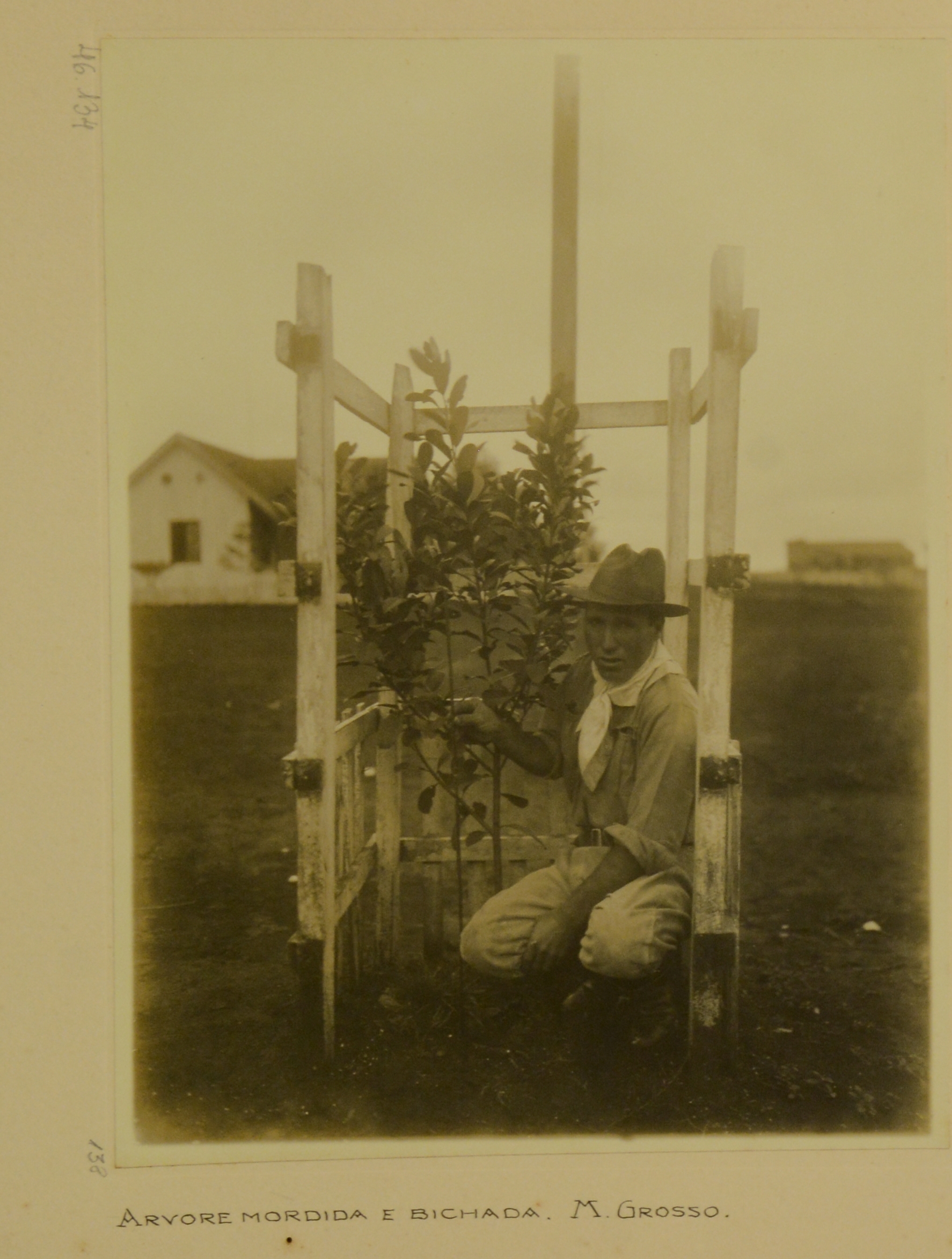 Uma pequena árvore e um homem dentro de cerca de madeira.