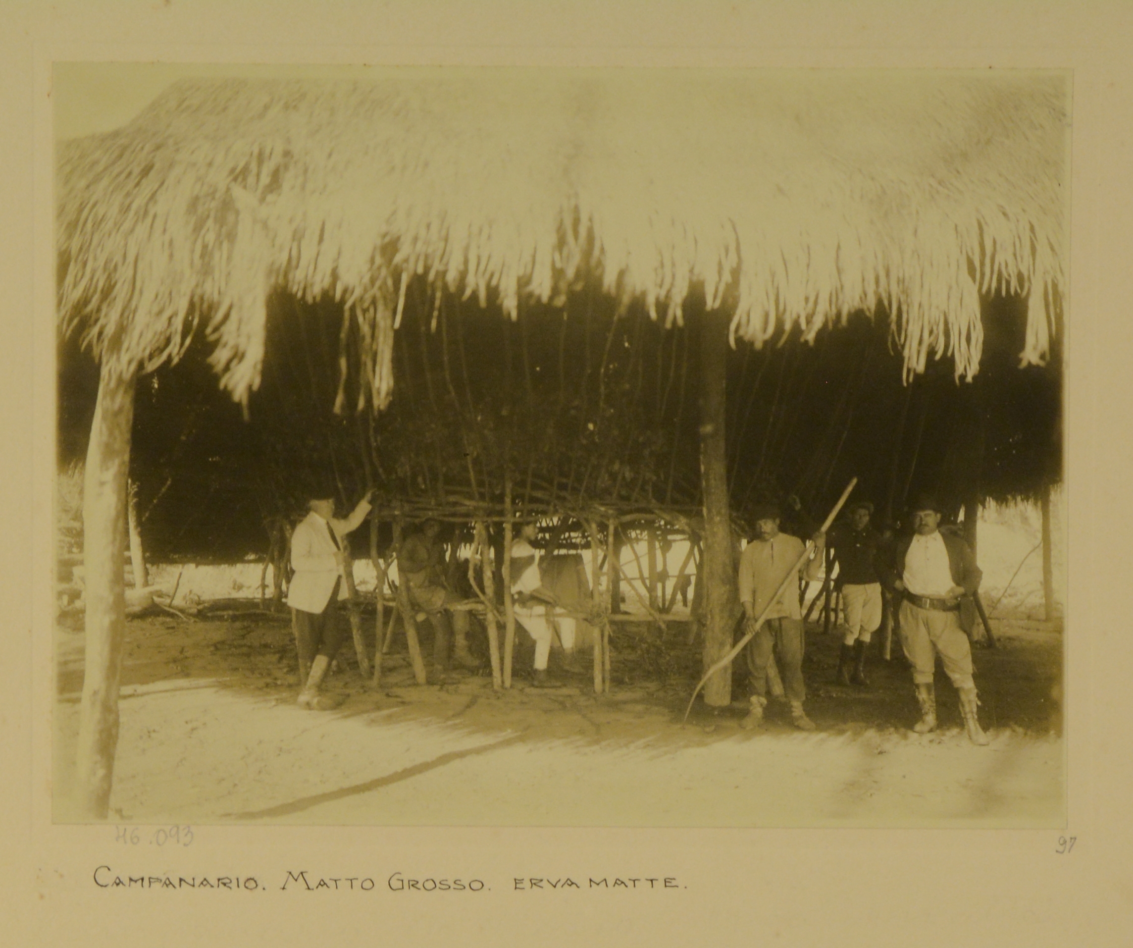 Pessoas sob um teto de sapê que parece ser um local se secagem da erva-mate.