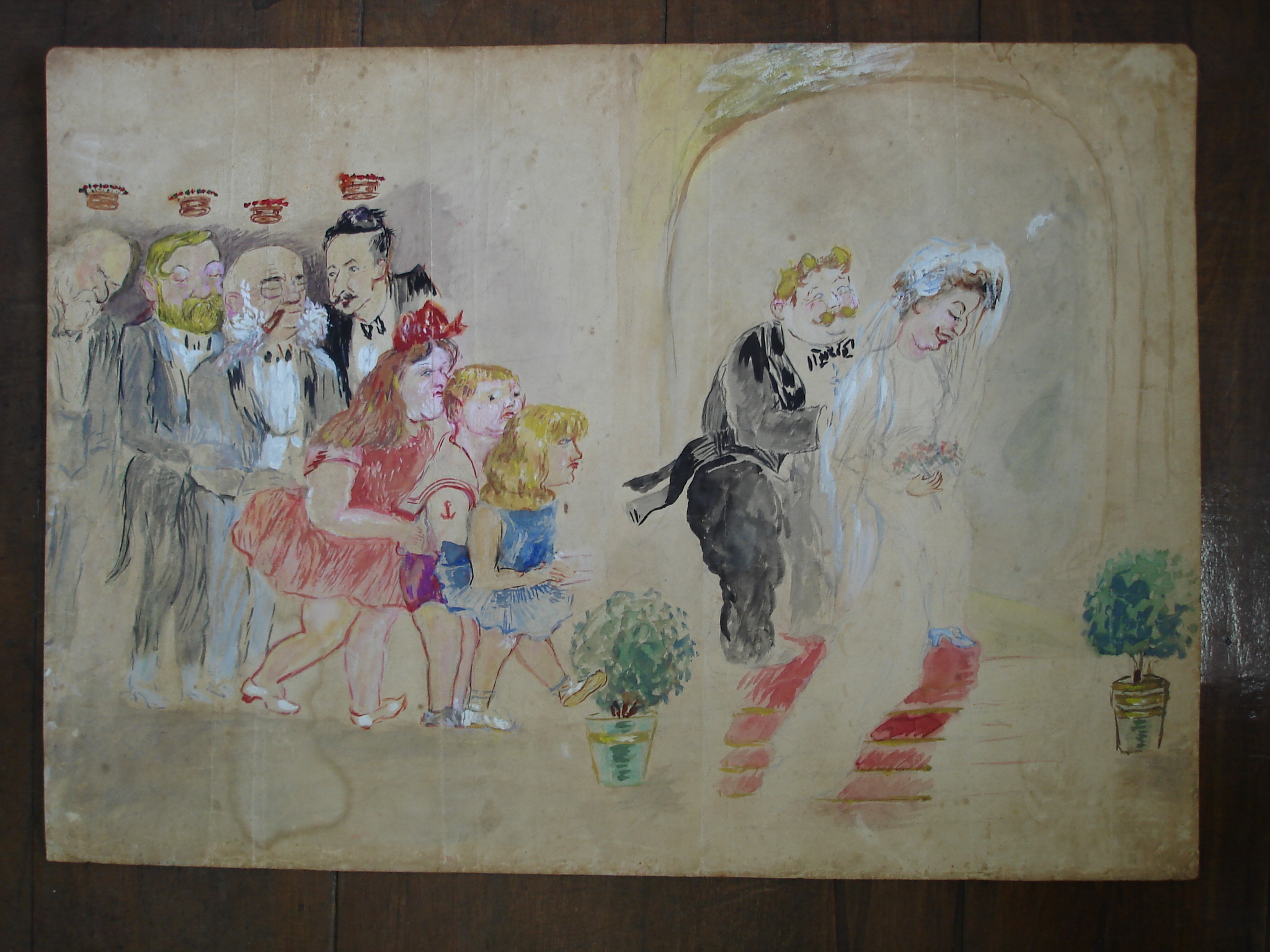 Caricatura de casamento de Rivadávia Corrêa, assistido, da esquerda para direita, pelos condes Modesto Leal, Paulo de Frontin, Fernando Mendes de Almeida e Afonso Celso