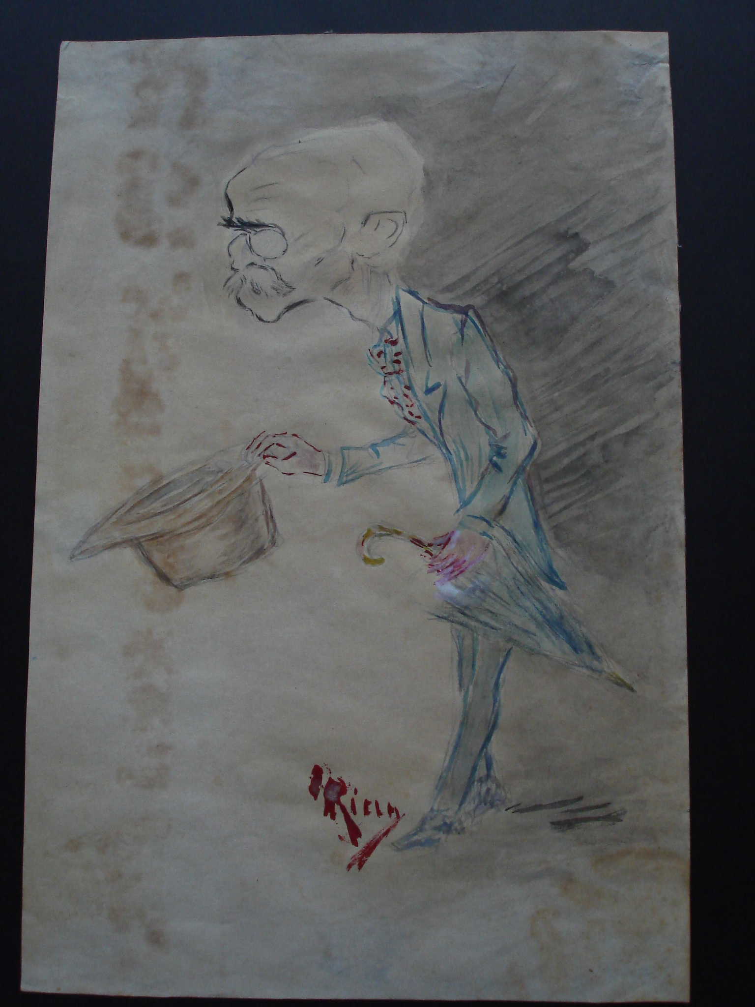 Rui Barbosa de corpo inteiro, segurando um guarda-chuva e um chapéu.