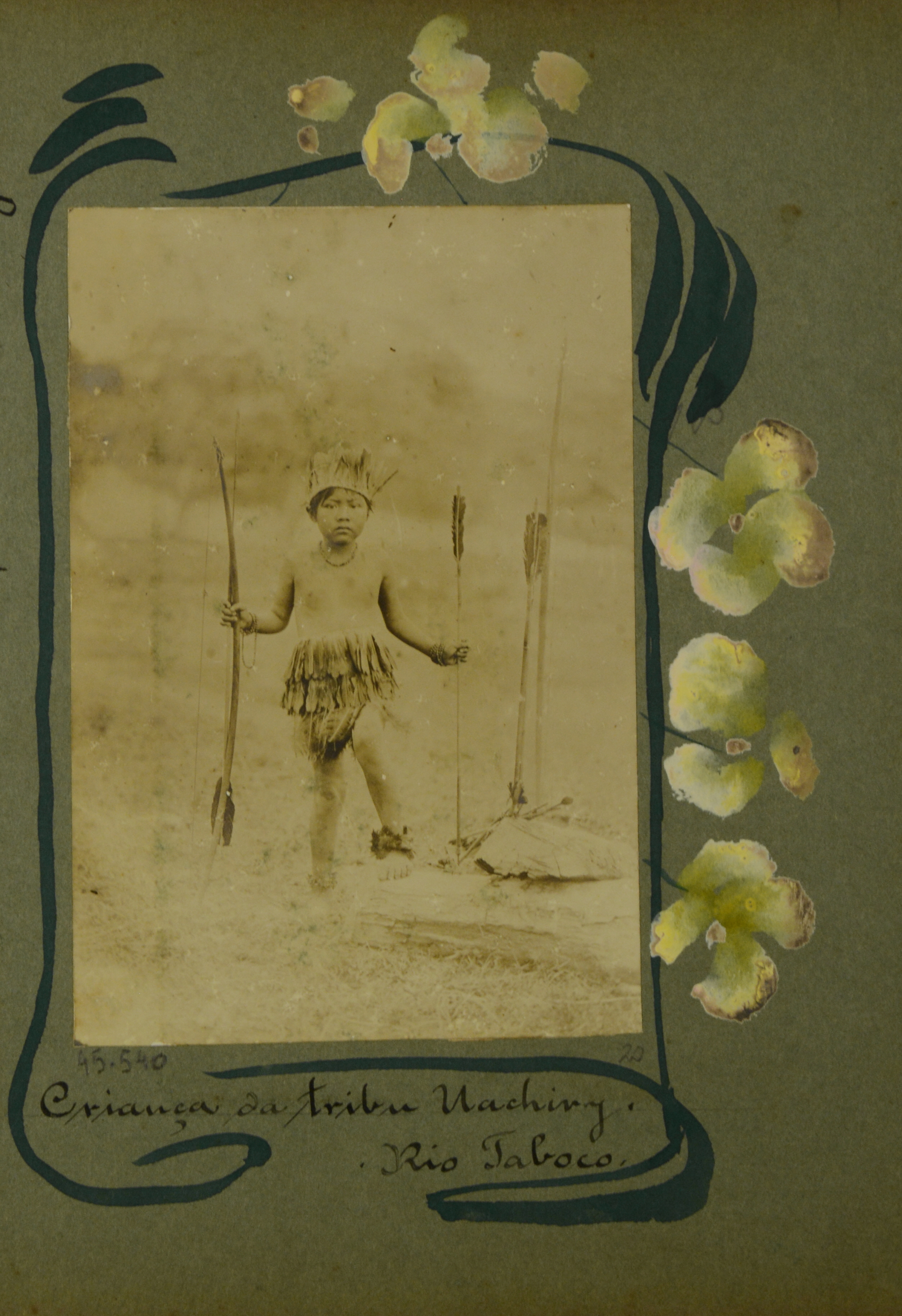 Uma criança indígena com vestimenta típica, segurando arco e flecha.
