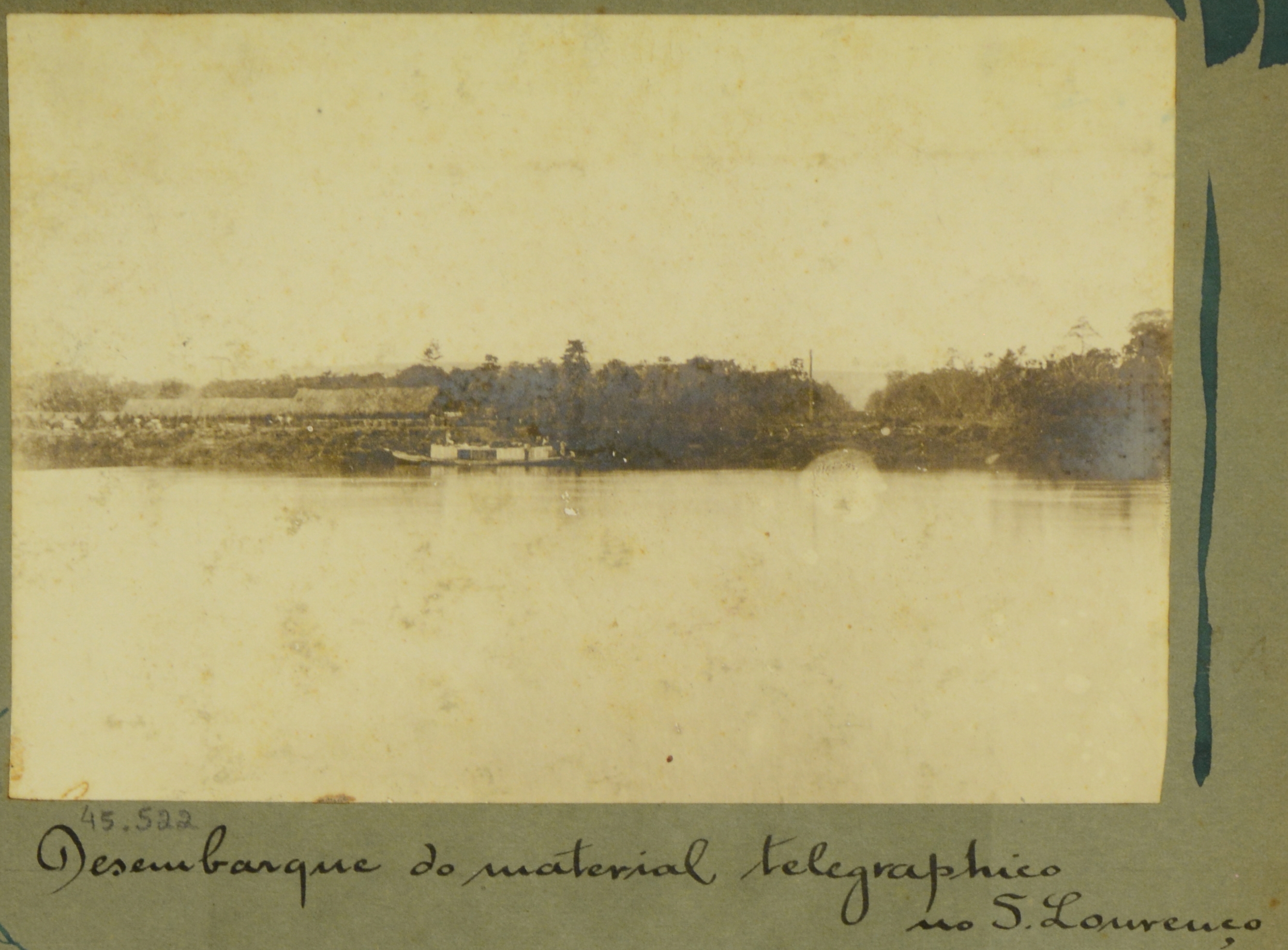 O rio São Lourenço em primeiro plano. Ao fundo, barco ancorado na margem para o desembarque. Vê-se construções em sapê.