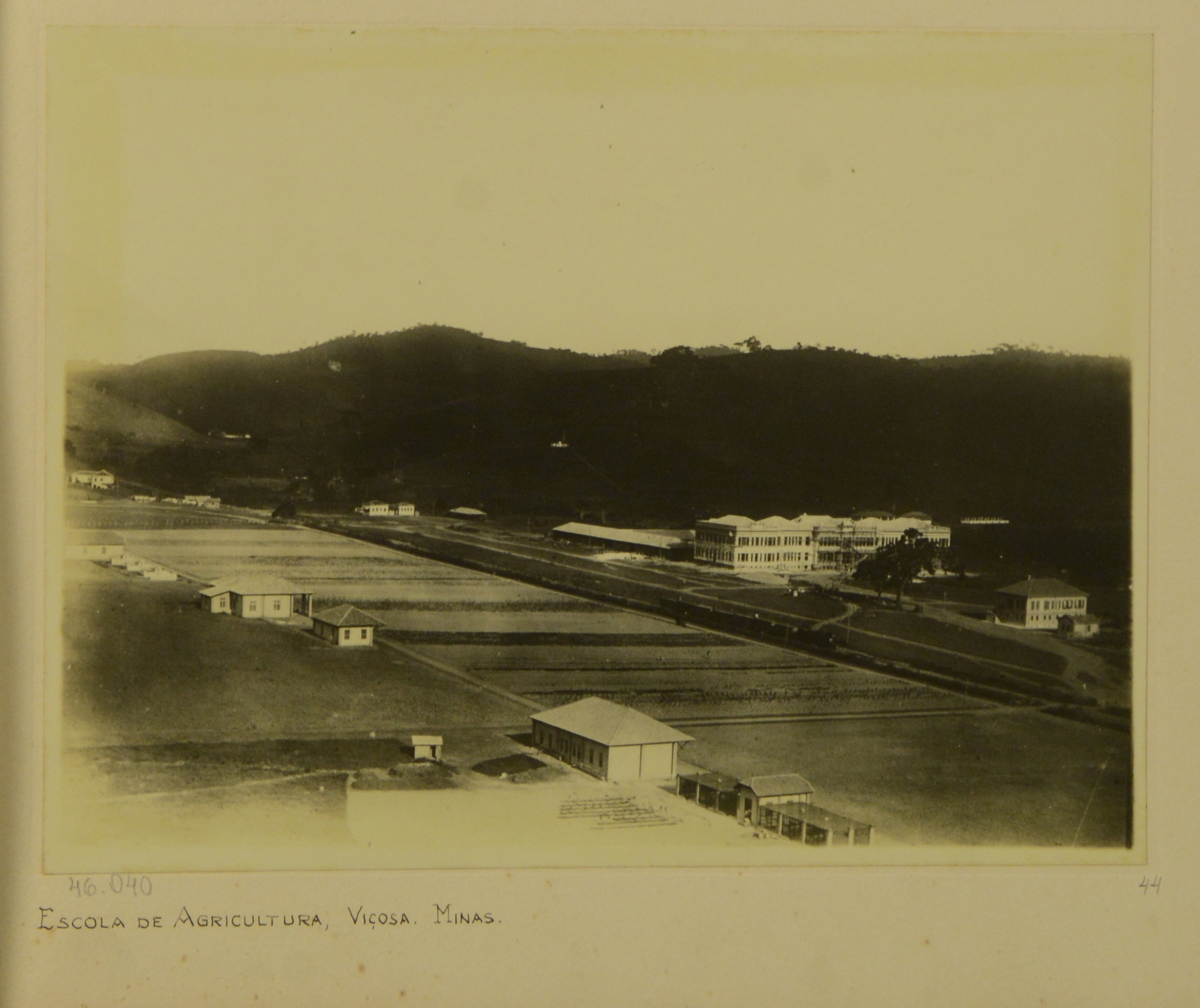 Vista de um campo de cultura vegetal e edificações da faculdade. Ao fundo as montanhas.