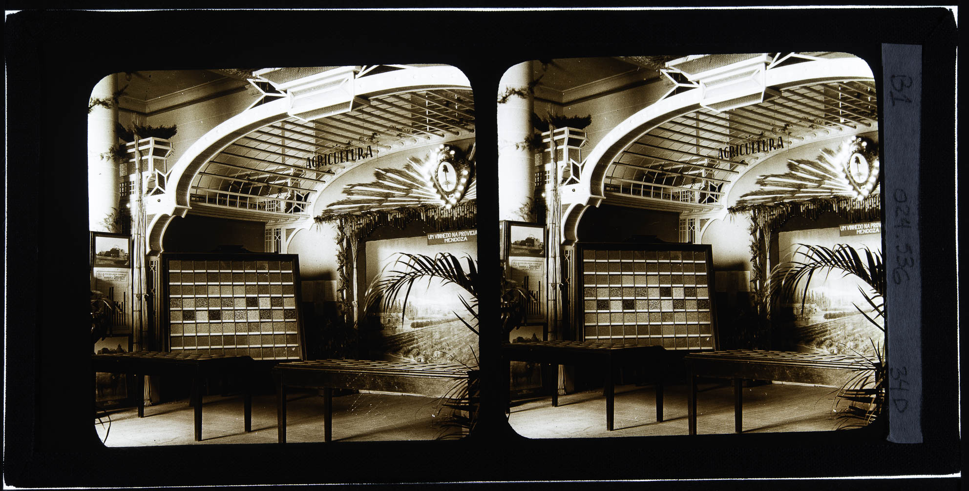 Vistas do Pavilhão Argentino. Interiores de stands de exposição. Observa-se os termos Agricultura, vinhedo e Mendoza.