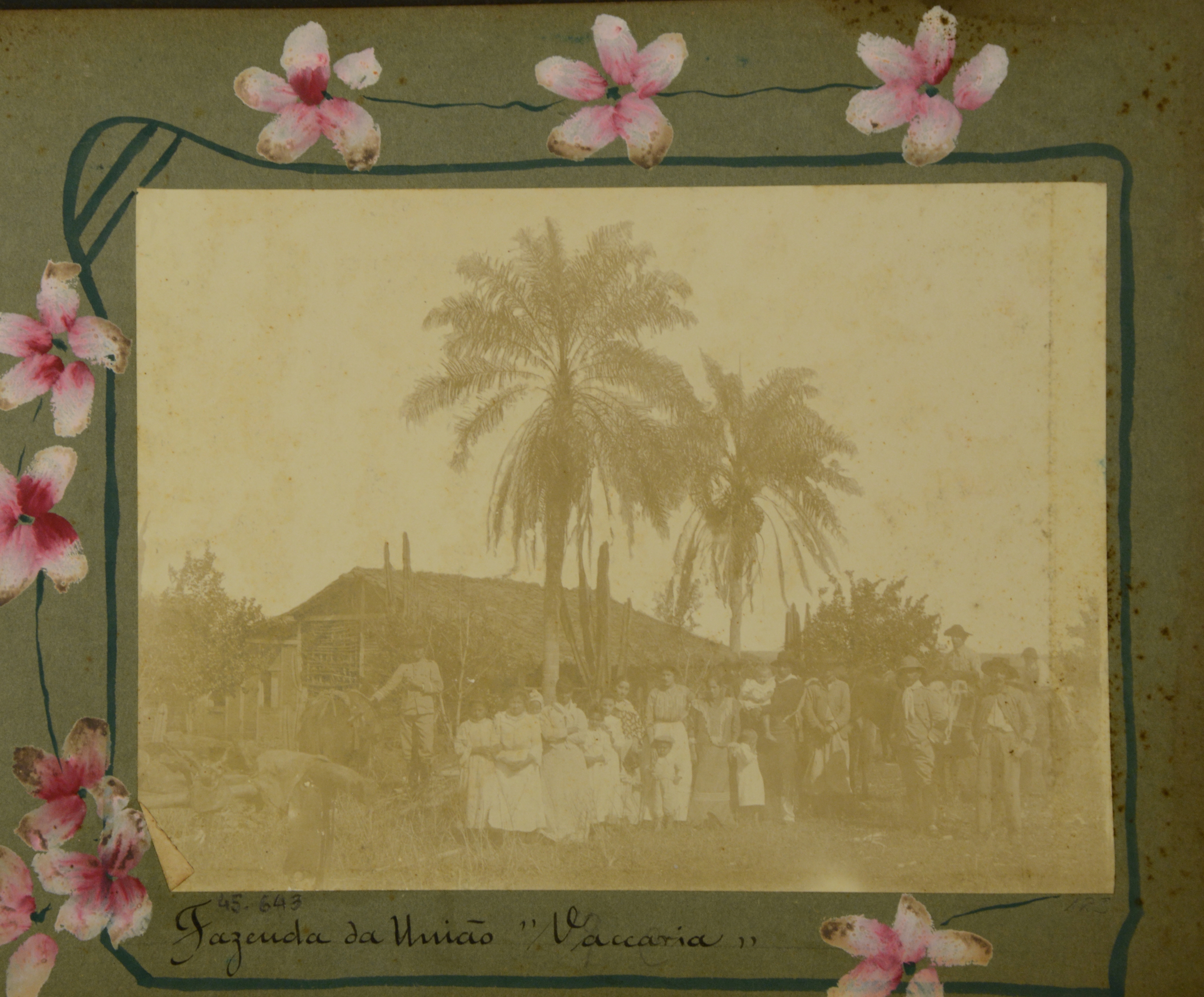 Homens, mulheres e crianças posando para foto na frente de construção de taipa e sapê.