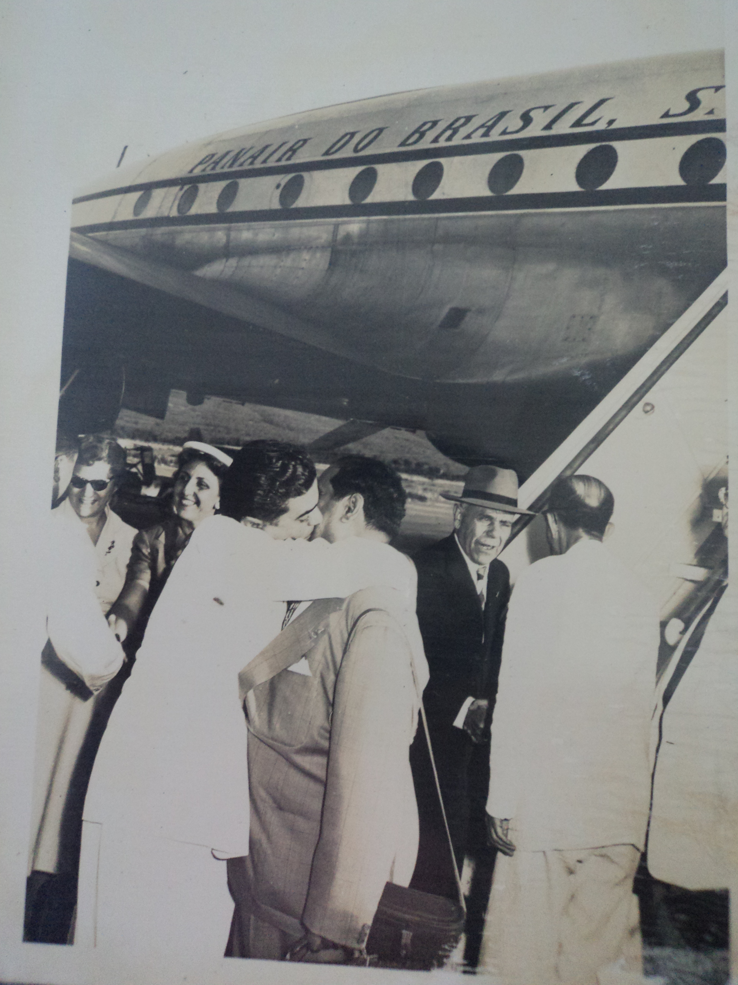 Fotografia de passageiros se cumprimentando e aeronave da Panair ao fundo
