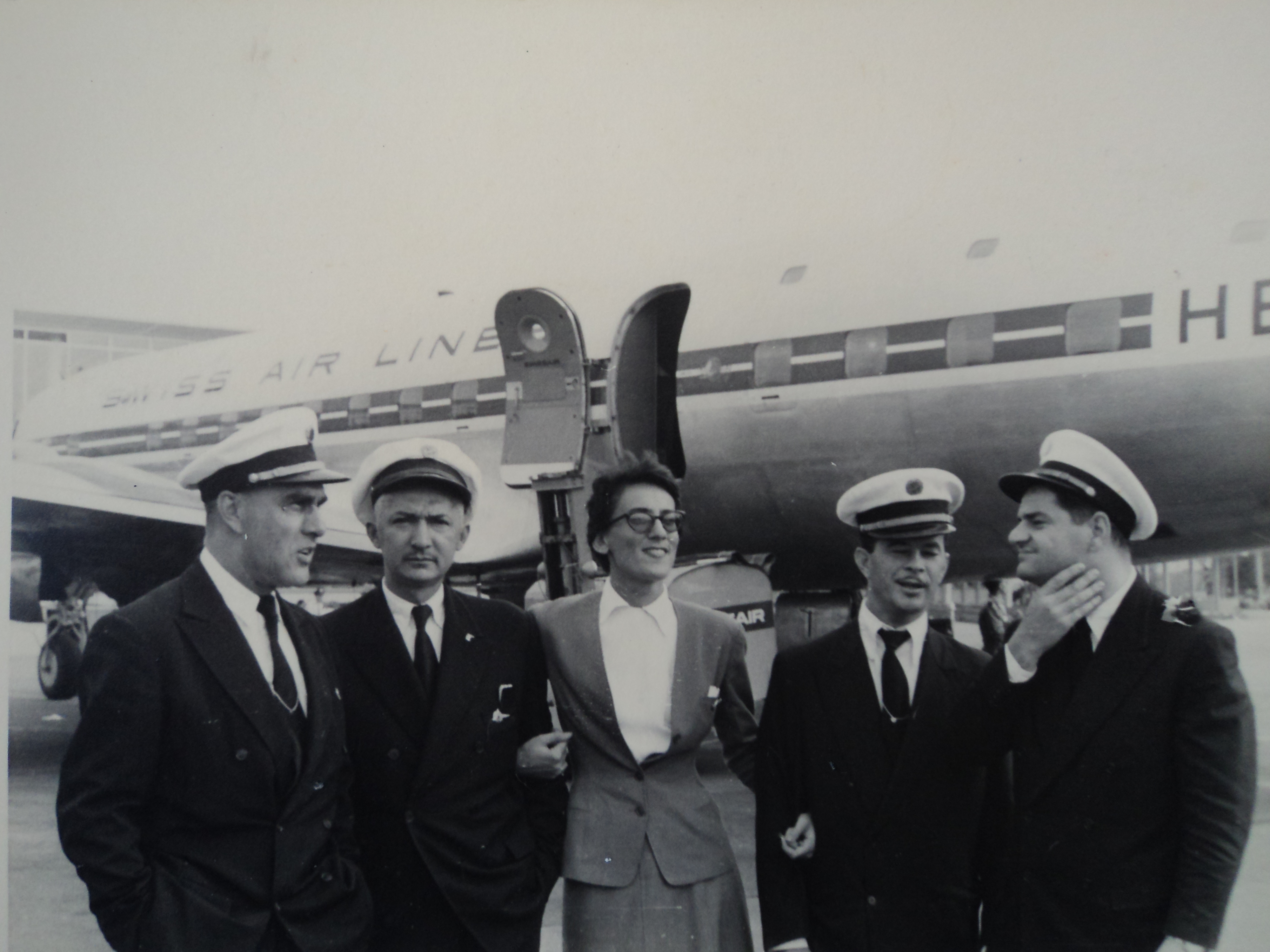 Fotografia de cinco funcionários da Panair (quatro homens e uma mulher) no aeroporto de Zurique, em 1953.