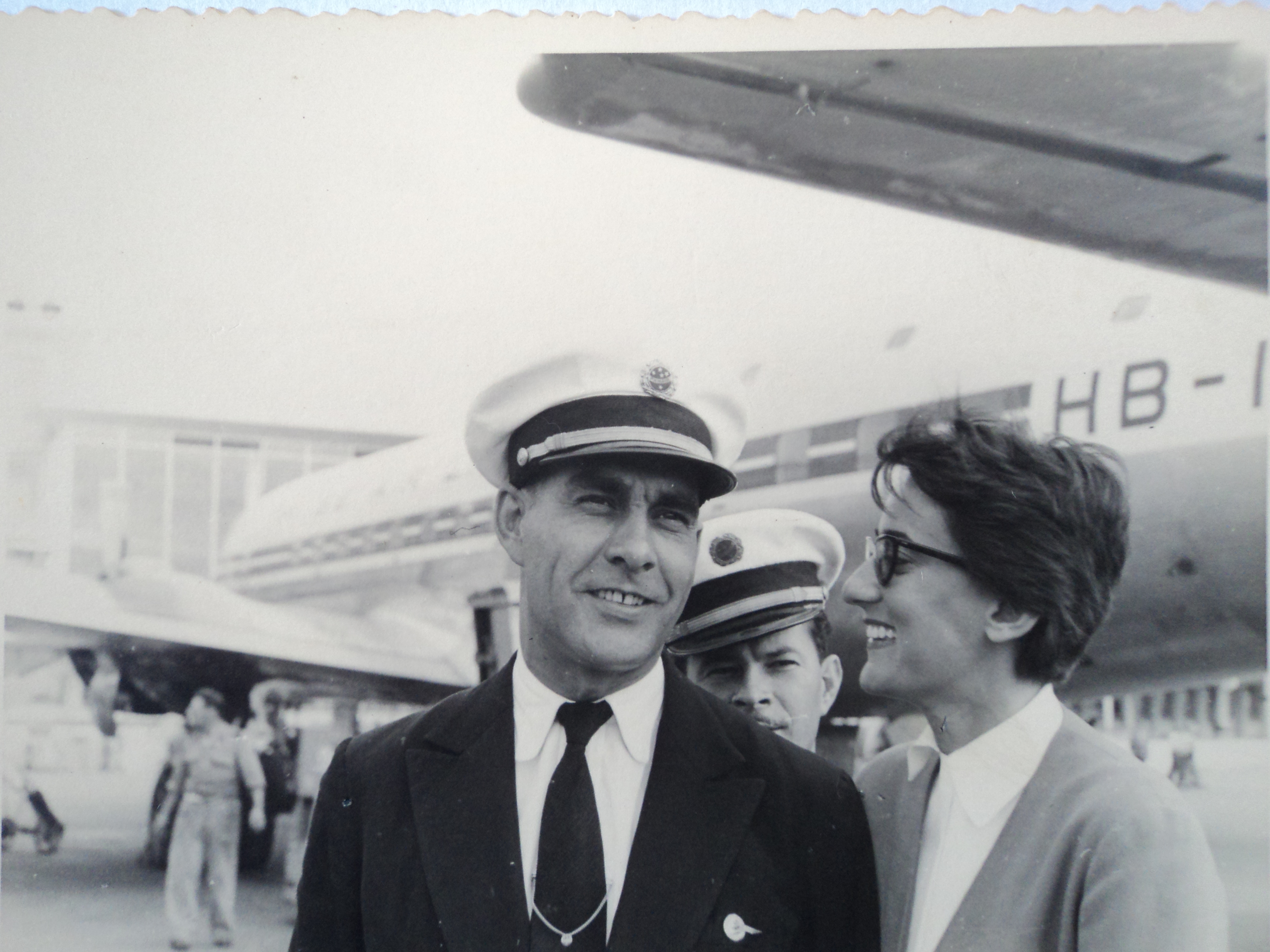 Fotografia de dois homens e uma mulher, funcionários da Panair no aeroporto de Zurique, em 1953.