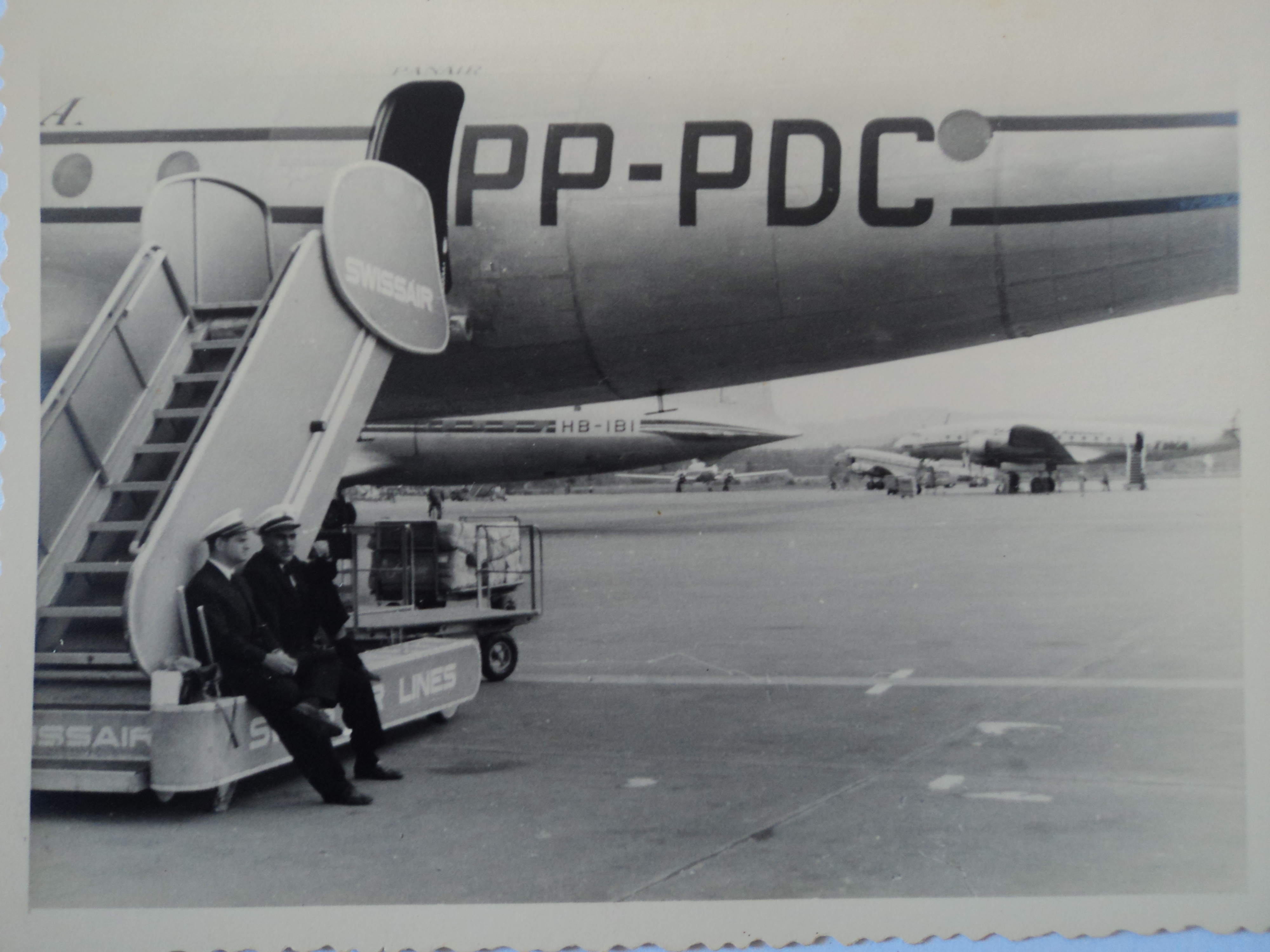 Fotografia de dois homens, provavelmente de funcionários da Panair, sentados em escada de acesso a uma aeronave da Suiss Air no aeroporto de Frankfurt, em 1953.