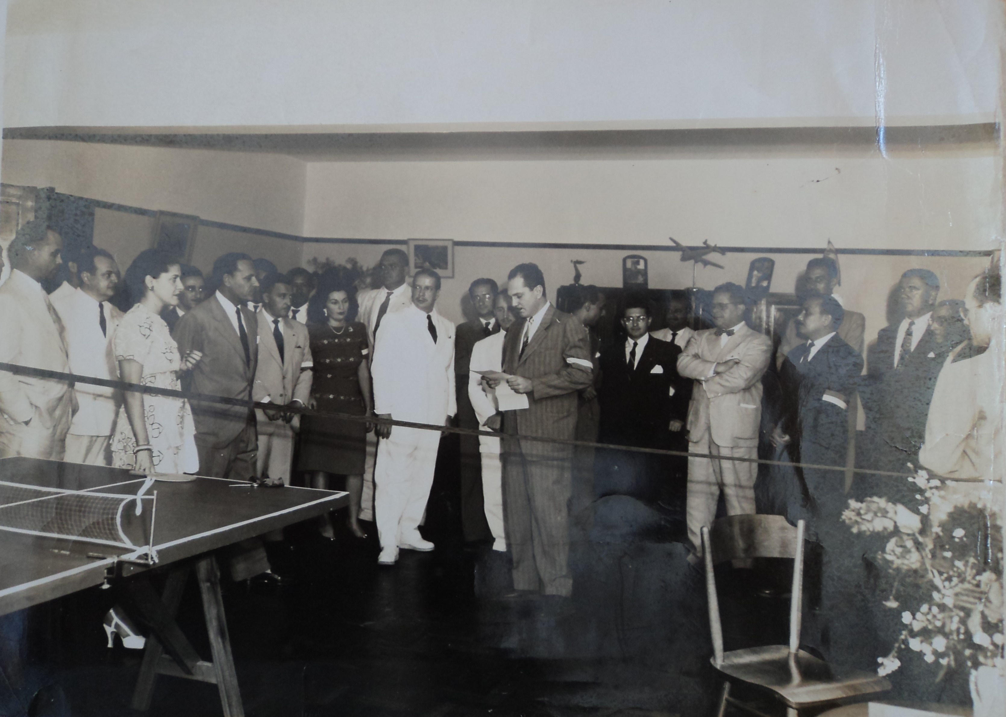 Fotografia de inauguração do Club Panair. Aparece, em meio a muitas pessoas, Nestor Cardoso lendo um discurso.