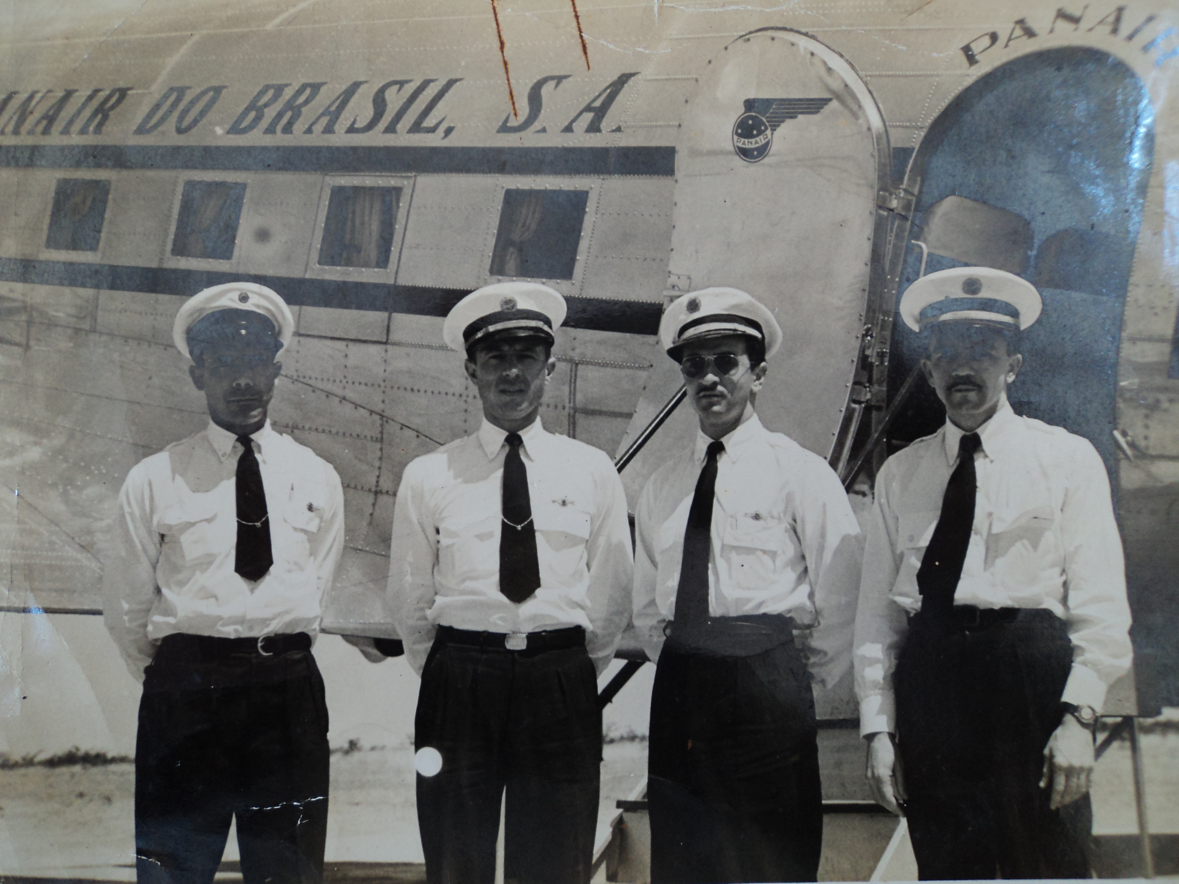 Fotografia de quatro funcionários (tripulantes) da Panair com uma aeronave da Panair ao fundo. Foto assinada por Eric Hess Photo. Rio de Janeiro.