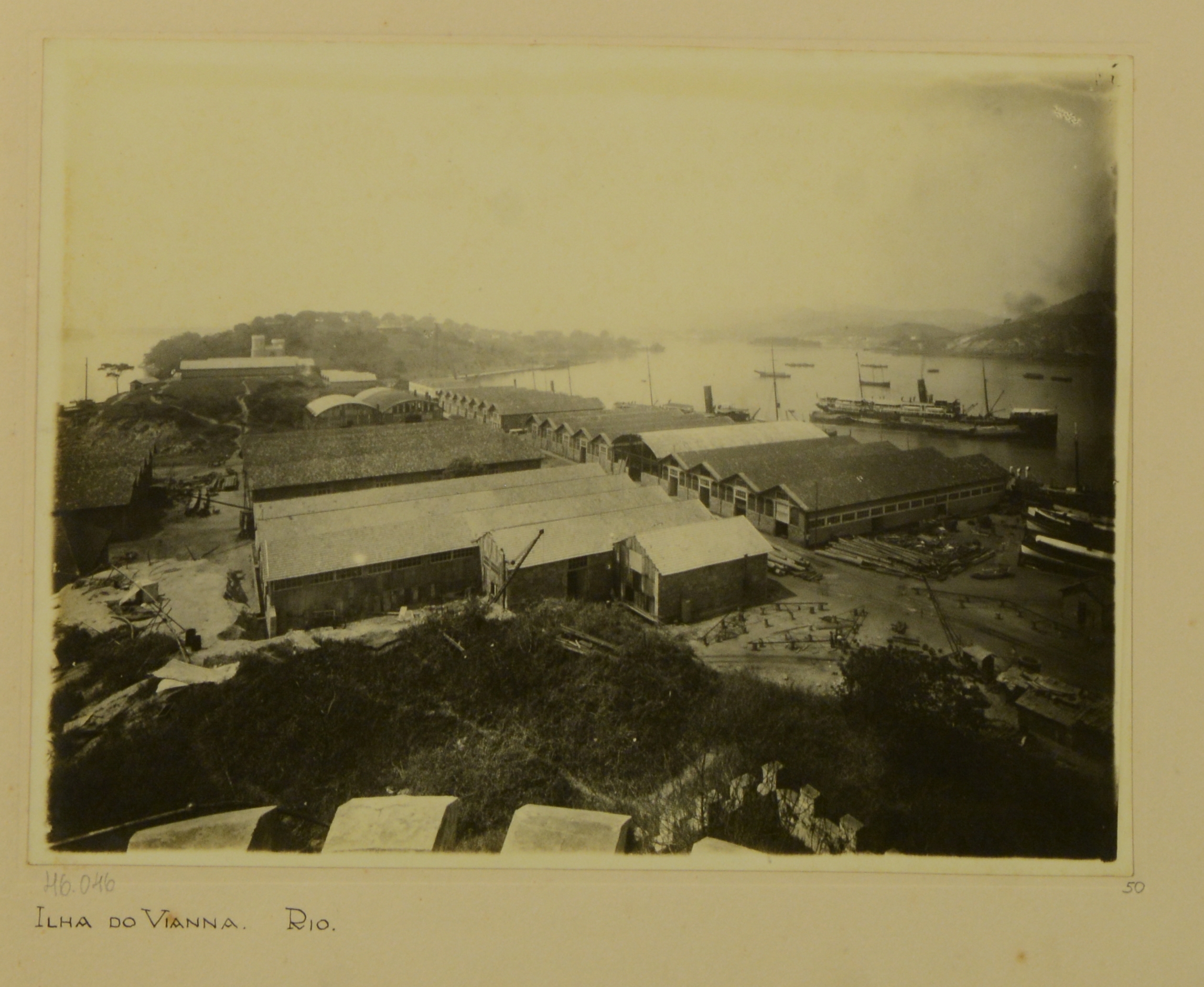 Vista a voo de pássaro de ilha no litoral da Niterói na baía da Guanabara, onde funcionava um estaleiro.