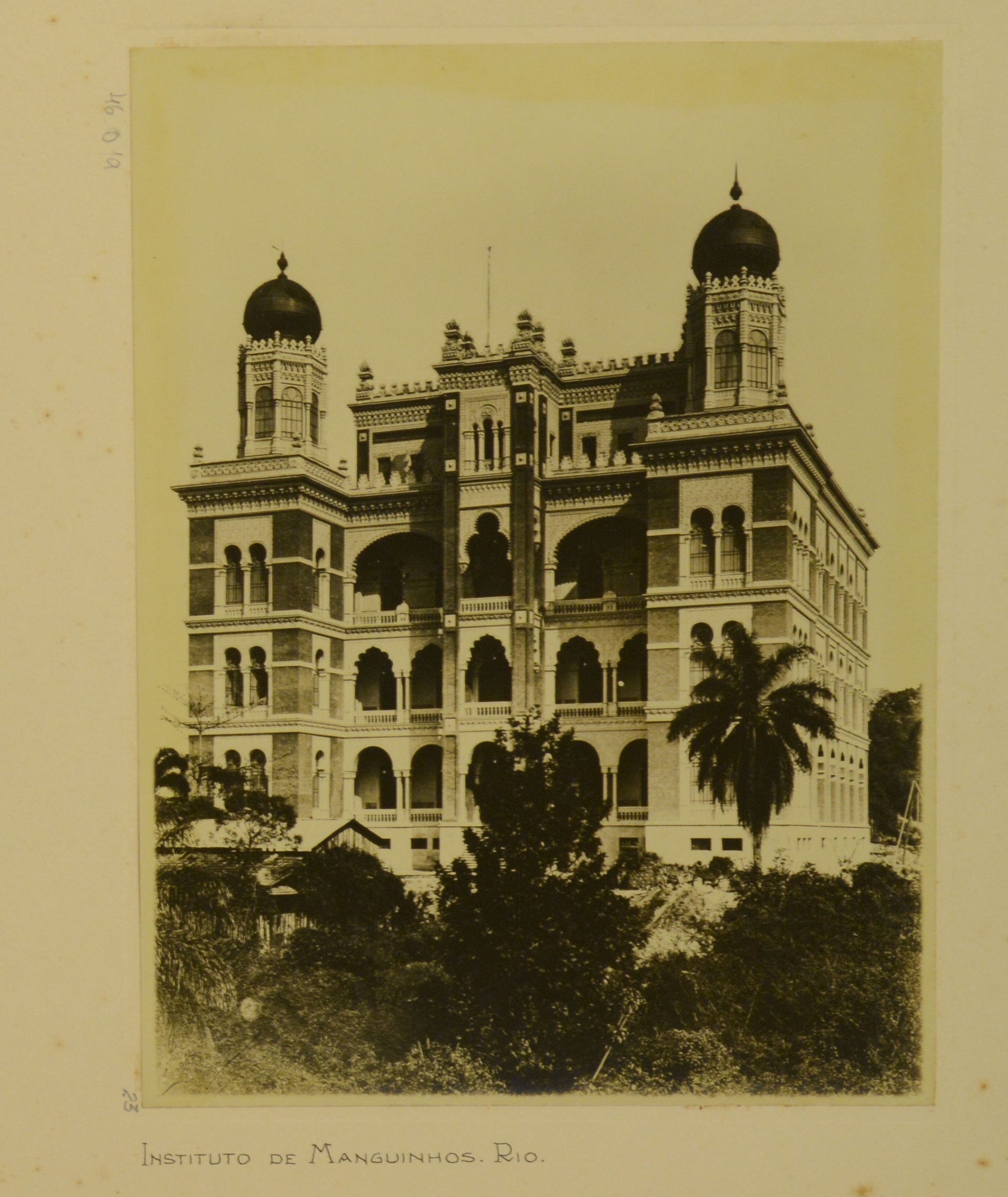 Palácio Mourisco de Manguinhos no centro da foto. Arvoredos em primeiro plano.