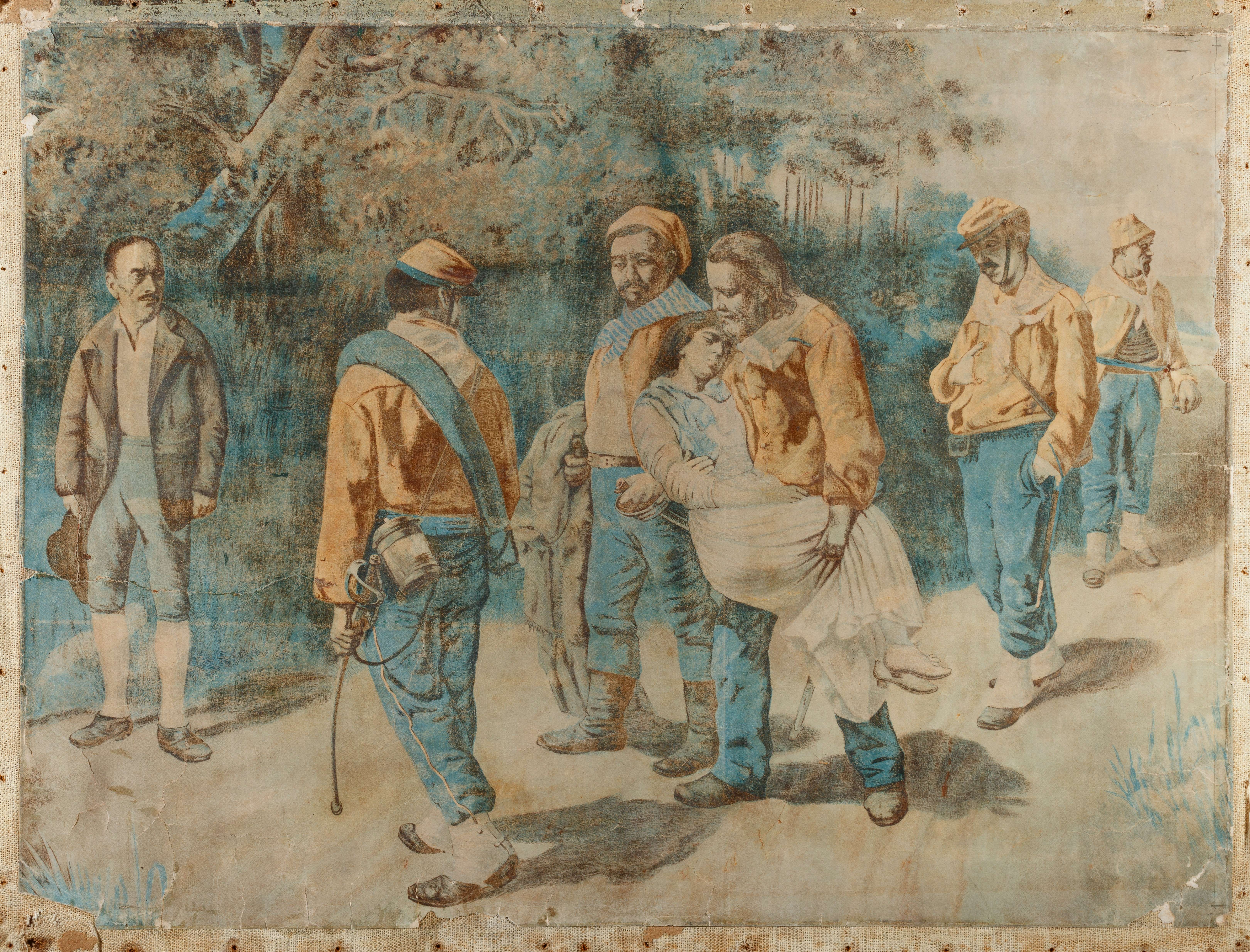 José Garibaldi carregando nos braços o corpo de sua esposa, ferida em campo de combate na Itália, em 1849.