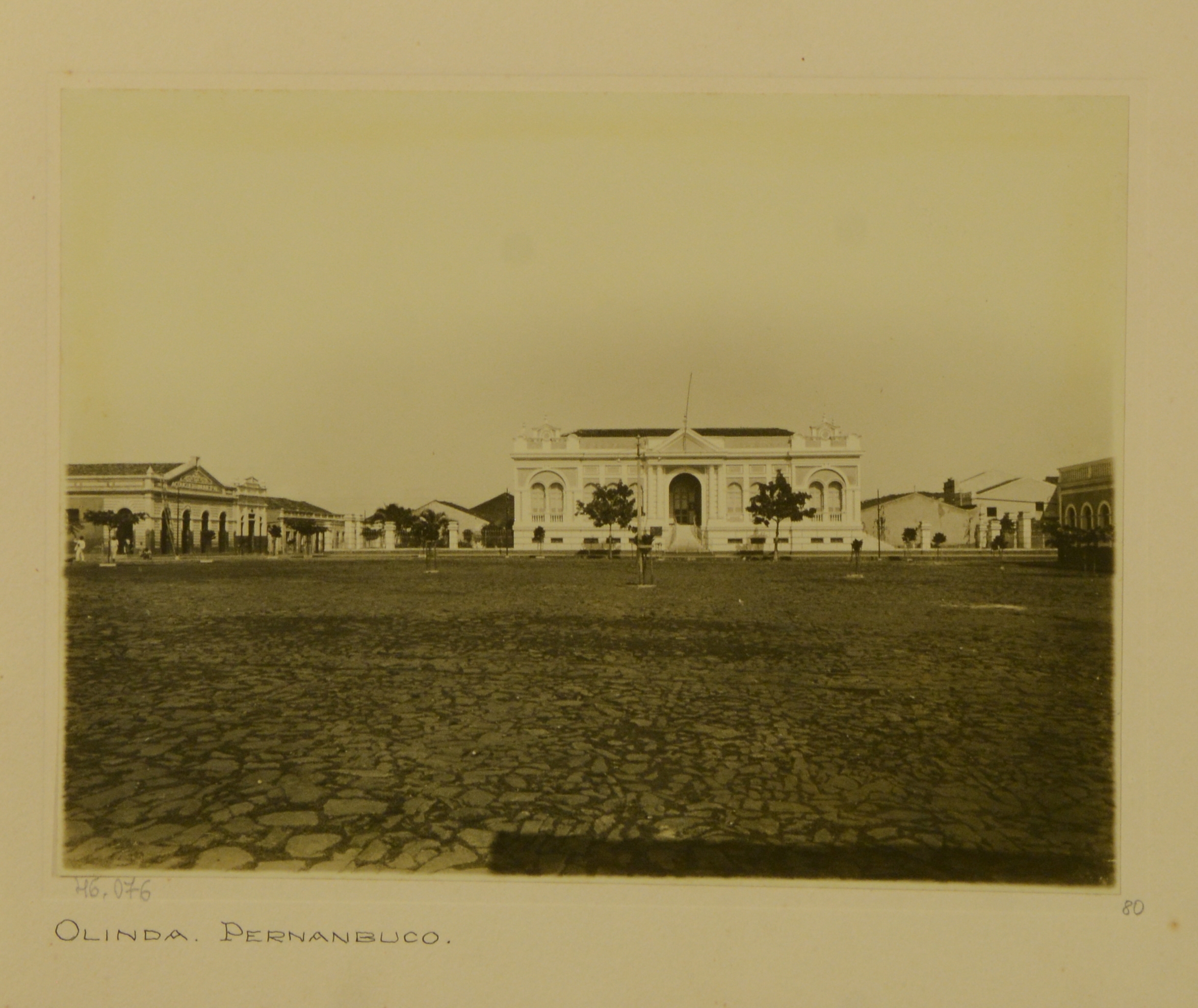 Em primeiro plano, o calçamento em pé de moleque olindense. Ao fundo, edifício provavelmente público.