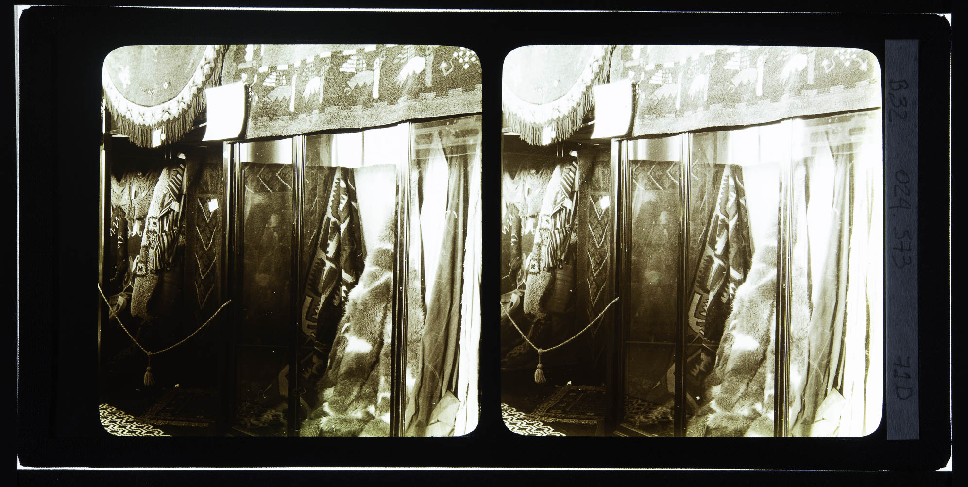 Vistas do Pavilhão Argentino. Interiores de stands de exposição. Decoração, tapetes, cortinas, colchas