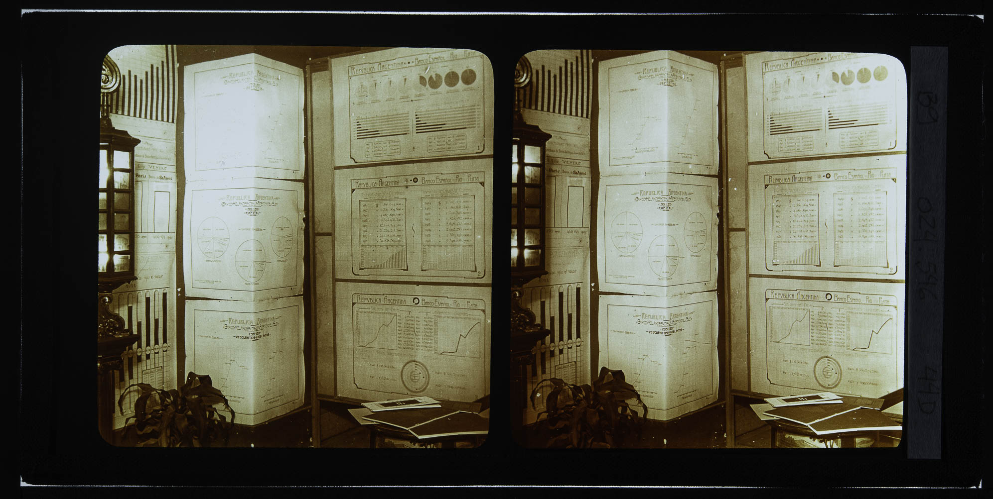 Vistas do Pavilhão Argentino. Interiores de stands de exposição. Banco Espanhol Rio da Prata