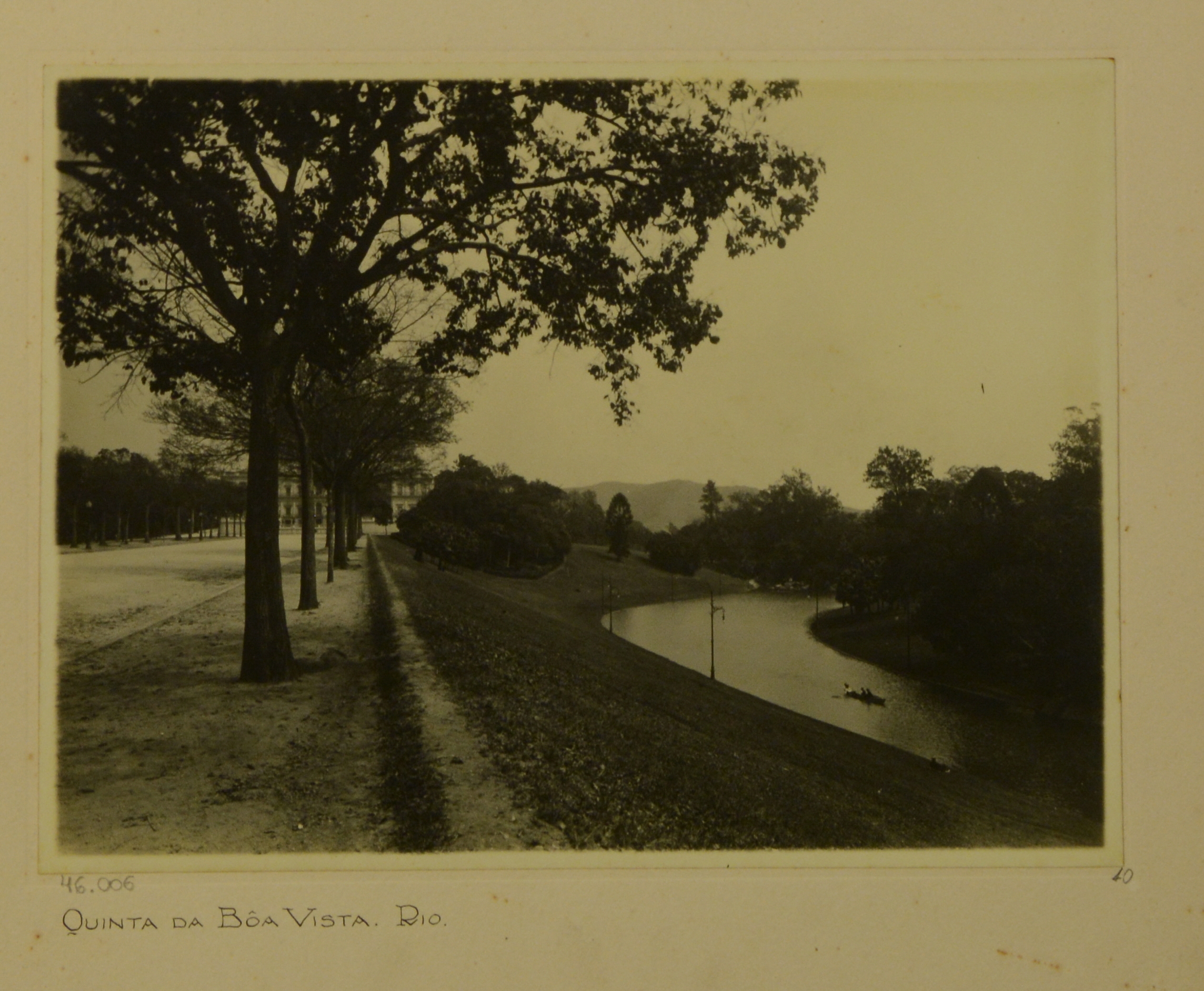 Parque da Quinta da Boa Vista. Vê-se um remador em lago, e ao fundo, o palácio e o Maciço Carioca.