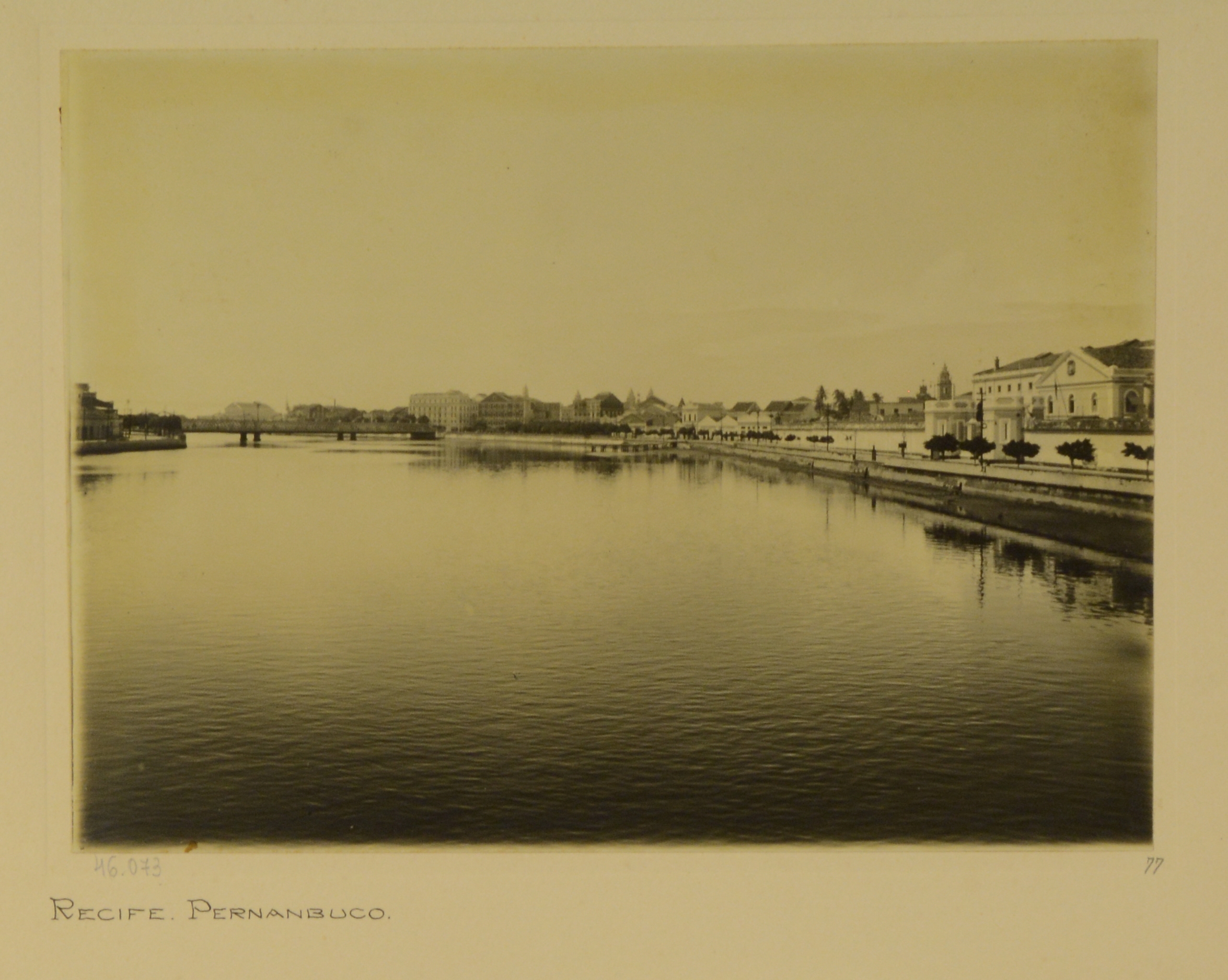 Vista da cidade. Em primeiro plano, as águas do Capiberibe, ao fundo uma ponte e a cidade.