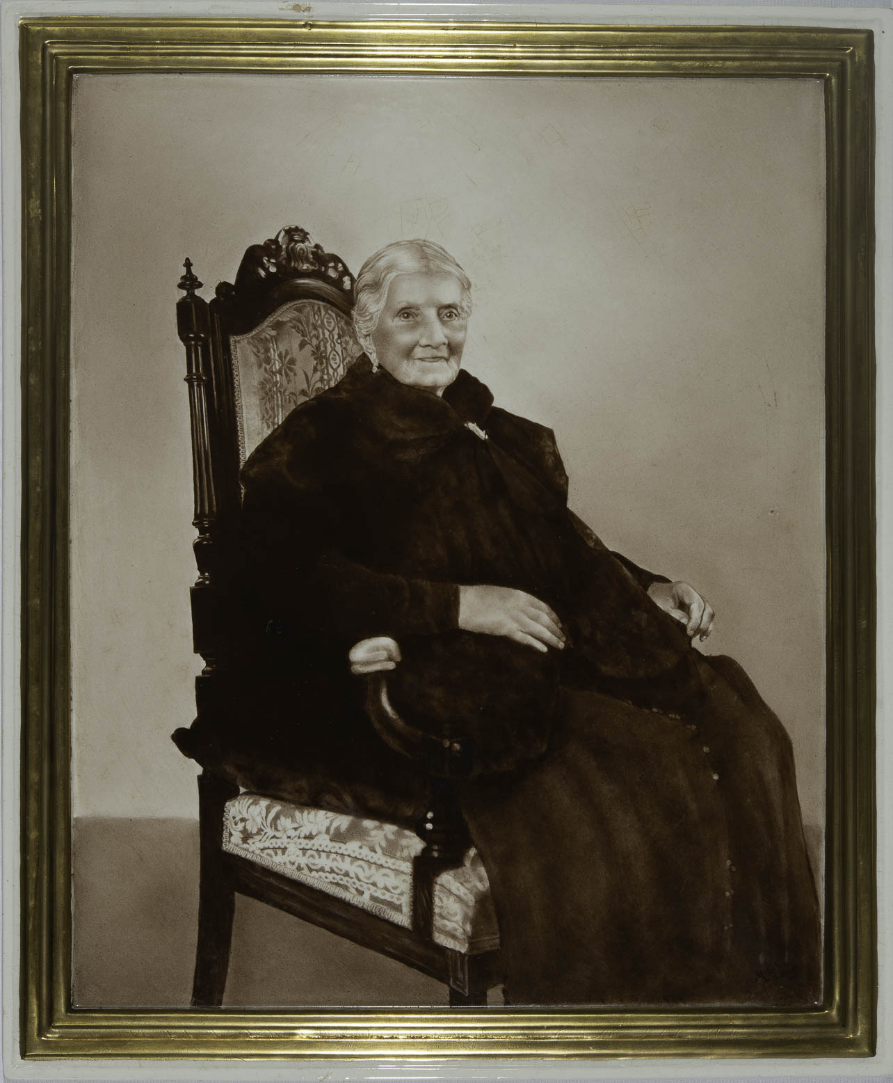 Inscrições: “Este retrato da Exma. Condessa do Pinhal foi tirado no seu centenário em 1945; foi produzido em louça na Fábrica Adelina de Barros Loureiro (...) São Paulo, e foi oferecido a Condessa pelo seu proprietário Sr. Comendador Mandel de Barros Loureiro” (inscrição manuscrita no compensado da moldura).
