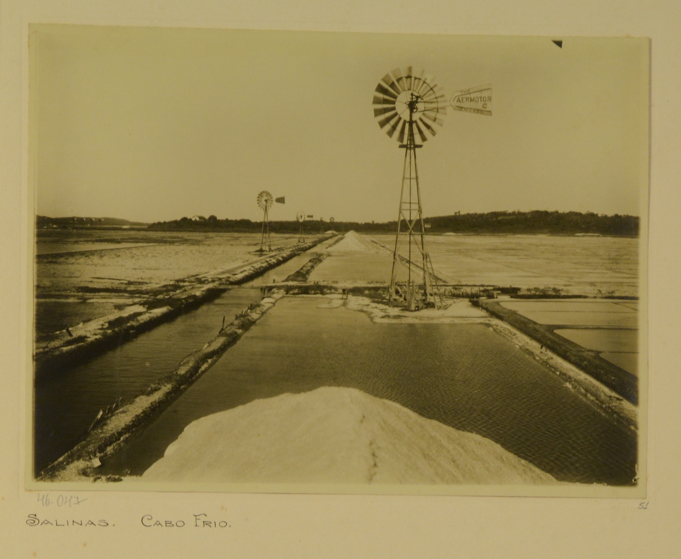 Vista das salinas. Em primeiro plano, um monte se sal, em médio e ao fundo, moinhos de vento.